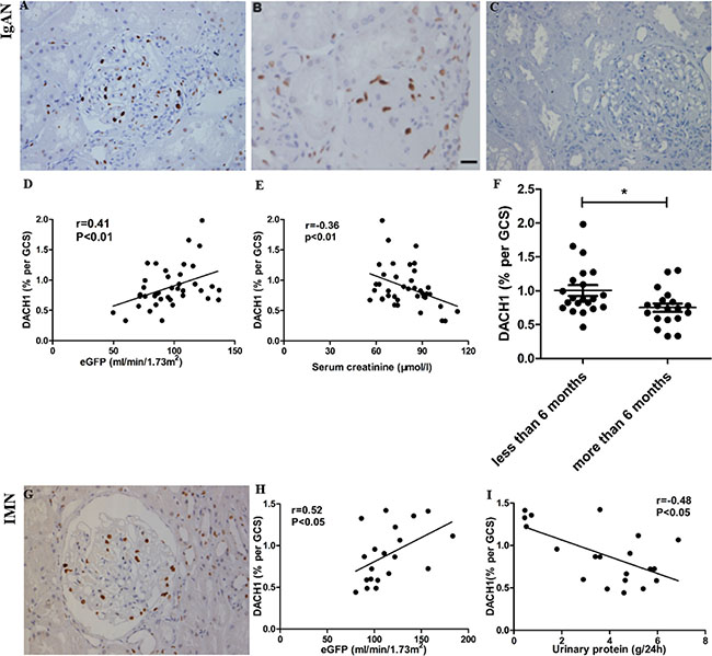 Figure 4: DACH1 expression in immunoglobulin A nephropathy (IgAN) and idiopathic membranous nephropathy (IMN) and its correlation with clinical parameters. (A and C) positive and negative control (NC) stained for DACH1 in a focal proliferative IgAN. (B) A modicum glomerular staining for DACH1 in scarred glomerulus in sclerotic class IgAN. (D) Glomerular DACH1 expression correlates strongly with eGFR in IgAN. (E) Glomerular DACH1 expression correlates negatively with serum creatinine in IgAN. (F) DACH1 detection is higher in patients with disease duration of less than 6 months. (G) section with positive staining for DACH1 in a phase II IMN. (H) Glomerular DACH1 expression correlates strongly with eGFR in IMN. (I) Glomerular DACH1 expression correlates negatively with 24 h urinary protein in IMN. All photos shown contain immunoperoxidase stains with hematoxylin counterstain, 400 magnification. GCS, glomerular cross section, Bar, 50 μm.