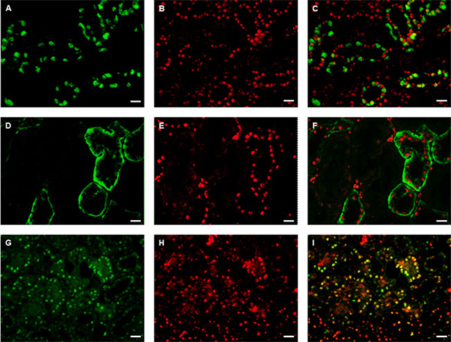 Figure 5: Double immunofluorescence staining for DACH1 and Bax/Bcl-2, PCNA in normal kidney. A representative micrograph of double immunofluorescence was performed for DACH1 (red) (B, E, H), Bcl-2 (green) (A), Bax(green) (D), PCNA (green) (G), Merged images (C, E, I). Original magnification is × 400, Bar, 50 μm.