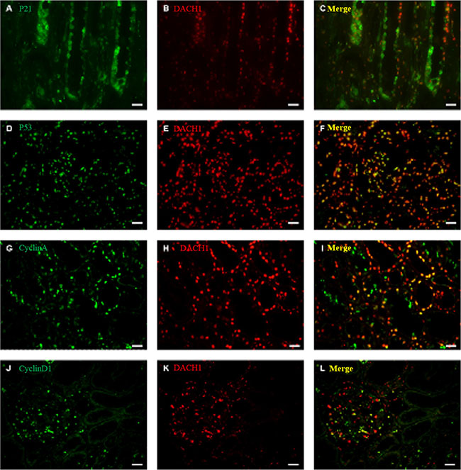 Figure 6: Double immunofluorescence staining for DACH1 and P21, P53, Cyclin A, Cyclin D1 in normal kidney. A representative micrograph of double immunofluorescence was performed for DACH1(red) (B, E, H, K), P21 (green) (A), P53(green) (D), Cyclin A (green) (G), Cyclin D1 (green) (J), Merge images (yellow) (C, F, I, L). Original magnification is ×400, Bar, 50 μm.