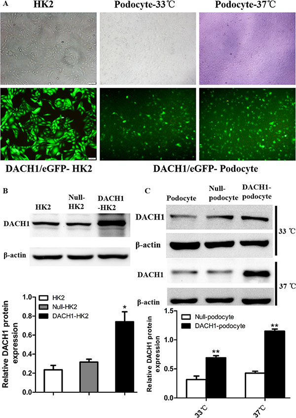Figure 7: HK2 and human podocytes transfected with the DACH1 plasmid. (A) HK2, podocyte cultured in a permissive temperature (33°C) and cultured in a nonpermissive temperature (37°C). transfection with Plasmid.GFP. (B) Western blotting analysis of the DACH1 protein in Plasmid.DACH1-transfected HK2 and summarized data showing that DACH1 expression. (C) Western blotting analysis of the DACH1 protein in Plasmid.DACH1-transfected podocytes and summarized data showing that DACH1 expression. The data are displayed as mean ± SEM; *P < 0.05; **P < 0.01 vs. Null-HK2 or Null-podocyte. All experiment were performed at least thrice with samples from independent experiments.