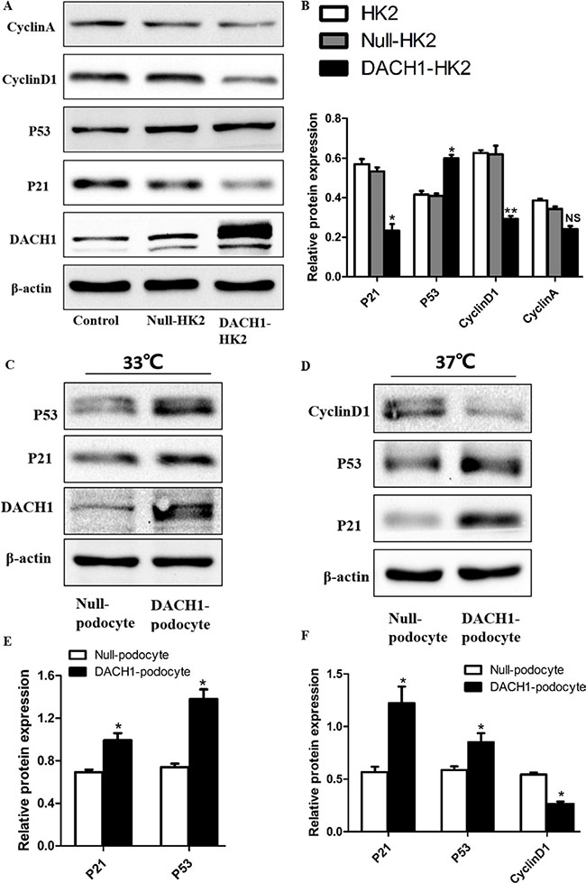 Figure 8: Effects of DACH1 overexpression on cell cycle-related proteins in HK2 and Podocytes. (A) Representative Western blot images and (B) summarized data showing DACH1, p21, p53, CyclinD1, CyclinA expression with Plasmid.DACH1-transfected HK2. (C) representative Western blot images and (E) summarized data showing that the abundance DACH1, p21, p53 were increased in Plasmid.DACH1-transfected podocytes cultured in a permissive temperature (33°C). (D) representative Western blot images and (F) summarized data showing that the abundance p21, p53 were increased, while CyclinD1 was decreased in Plasmid.DACH1-transfected podocytes cultured in a permissive temperature (37°C). *P < 0.05 vs. Null-HK2 or Null-podocyte. All experiment were performed at least thrice with samples from independent experiments.