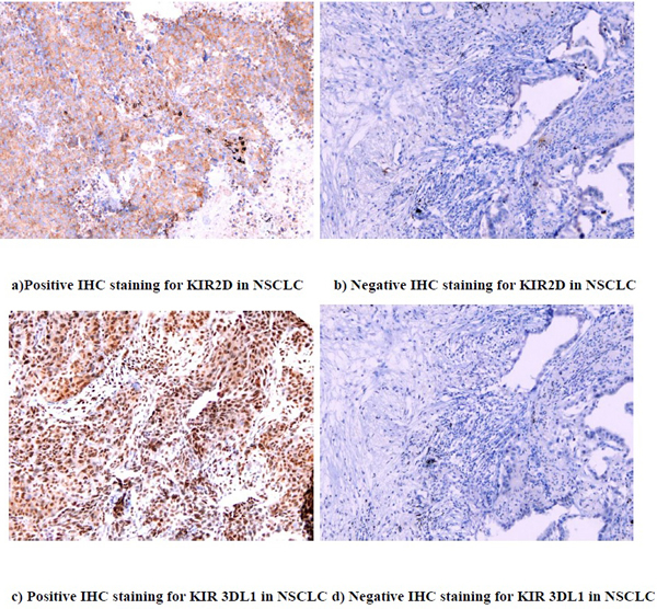 In this study, we investigated KIR 2D (L1, L3, L4, S4) and KIR 3DL1 protein expression in NSCLC patient tumor tissues by immunohistochemistry (IHC) and analyzed the correlation between KIR 2D (L1, L3, L4, S4), KIR 3DL1 and clinical pathological characteristics. We also conducted survival analysis in NSCLC patients.