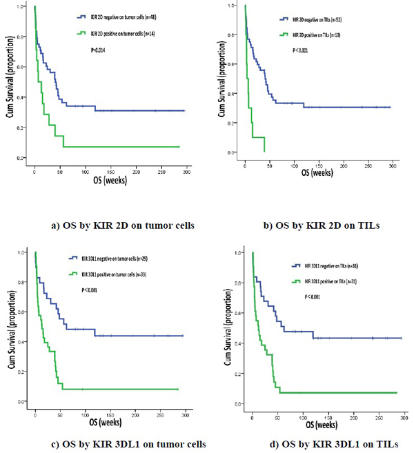 Cox regression analysis showed that KIR 2D (L1, L3, L4, S4) on TILs was correlated with OS (P = 0.032, Odds Ratio 2.628 95%CI 1.089-6.340) (Table 2).