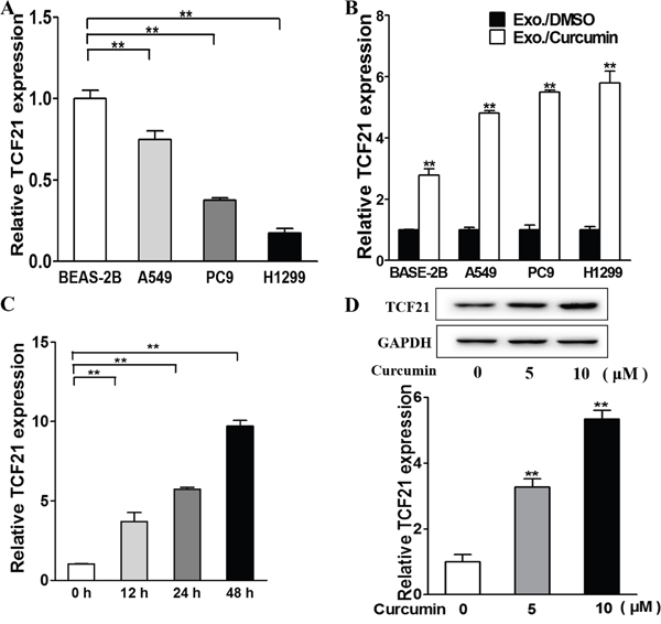 Figure 2: Exosomal TCF21 are down-regulated in lung cancer cell and are up-regulated by curcumin. A. Relative exosomal TCF21 expression levels of normal lung cell and lung cancer cells were analyzed by RT-PCR and normalized to BEAS-2B group. ** p<0.01. B. The cells were treated with 10 μM curcumin or DMSO and after 48h the exosomes were collected from the supernatant of the cells. The relative exosomal TCF21 expression levels were analyzed by RT-PCR and normalized to DMSO group. ** p<0.01. C. The H1299 cells were treated with 10 μM curcumin or DMSO for different time points and the relative exosomal TCF21 expression levels were analyzed by RT-PCR and normalized to control group. ** p<0.01. D. H1299 cells were cultured with different concentration (0, 5, 10 μM) of curcumin and the exosomes were collected after 48 h. The BEAS-2B cells were cultured with the exosomes respectively and after 48h total proteins of each cell were subjected to western blotting and detected for TCF21 expression levels.