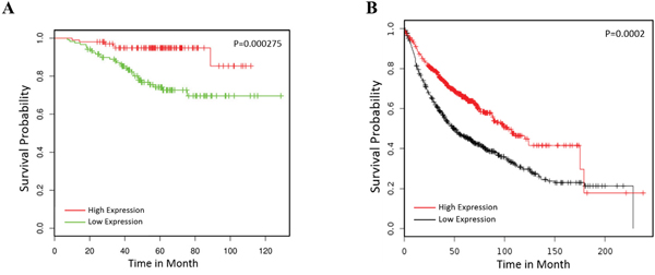 Figure 3: TCF21 is a positive biomarker in lung cancer prognosis. A. The GEO database GSE31210 was employed to analyze the prognosis of lung cancer patients with high or low expression of TCF21 (TCF21 low expression group, n=120; TCF21 high expression group, n=102). B. The Kaplan Meier plotter was employed to analyze the prognosis of lung cancer patients by TCF21 (TCF21 low expression group, n=572; TCF21 high expression group, n=573).