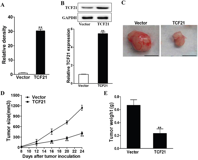 Figure 6: TCF21 suppresses tumor growth. The H1299 cells were infected with TCF21 or Vector lentivirus to establish stable cell lines. A-B. Relative TCF21 expression levels of the stable cells were analyzed by RT-PCR and western blotting. ** p<0.01. C, D, E. H1299/Vector and H1299/TCF21 cells were dispersed in 100 μl of serum-free 1640 medium and were subcutaneously injected into each side of posterior flank of the nude mice (n=4). Tumors were measured every four days since they were apparently seen and the volumes were calculated using the following formula: volume = 0.5 × Length × Width2. The tumor was excised and weighed after 24 days with representative pictures of tumors shown (Bar = 10 mm).