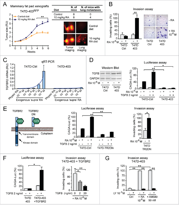 Figure 3: RA promotes breast cancer cell invasion via RARA-PI3K when it cannot reactivate transcriptionally silent tumor suppressor RARA-target genes: A proof of concept. A. A RA-enriched diet promotes not only the growth of RFP-positive T47D403 xenograft tumors (left), but also the formation of lung metastases (right) (**p<0.01). B. High ‘supraphysiological’ RA promotes T47D403 invasion in the Boyden chamber assay (Giemsa-stained invading cells in representative fields are shown on the right) (**p<0.01). C. ‘Supraphysiological’ RA induces TGFBR2 transcript significantly less in T47D403 than in T47DCtrl (RA≥10-7M = *p<0.05) D. Consistently, T47D403 cells cannot transduce the signal of both endogenous TGFB (detected by western blot in D, left) and exogenous TGFB, alone or in combination with exogenous RA (shown by CAGA-luc assay in D, right) (*p<0.05, **p<0.01). E. Stable expression of a TGFBR2 dominant negative (DN) mutant (left) in T47DCtrl cells (T47DTR2DN), by inhibiting TGFB signaling (assessed by CAGA-luc assay, middle), makes cells invade more in response to exogenous RA (right) (*p<0.05, **p<0.01). F. Conversely, stable expression of TGFBR2 in T47D403 cells, by re-enabling TGFB signaling (CAGA-luc assay, left), counteracts RA-induced cell invasion (right) (*p<0.05, **p<0.01). G. RA-induced T47D403 cell invasion implicates activation of RARA-PI3K signaling, because PI3K inhibition by LY294002 (LY) significantly counteracts cell invasion induced by either exogenous RA or the RARA agonist AM580 (**p<0.01). Student’s t-test was used for in vitro studies and ANOVA for in vivo studies.