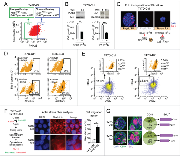 Figure 4: Both cell context-specific physiological endogenous RA synthesis and transcriptional functionality of RARA differentially determine breast cancer cell fate. A. Cytofluorimetric analysis of PKH26-labeled T47DCtrl cells shows that the fast-proliferating cell subset (green frame) contains more cells with high ALDH activity (ALDHhigh cells, detected by Aldefluor staining) and expresses more P-AKT relative to the slow-proliferating cell subset (blue frame). B. Inhibition of either ALDH-mediated RA synthesis with DEAB (left), or PI3K activity with LY294002 (right) results in a decrease of both P-AKT level (top) and cell proliferation (bottom) (**p<0.01, ***p<0.001). C. Treatment with either DEAB or LY294002 inhibits T47DCtrl proliferation also in 3D culture. D-E. Increased inhibition of RARA transcriptional function in T47D403 cells leads to expansion of both ALDHhigh (D) and ALDHhigh/CD44high/CD24low (E) subpopulations relative to T47DCtrl. F. Global gene/protein expression analyses highlight pro-invasive molecular changes in T47D403 vs. T47DCtrl (left). Consistently, T47D403 cells show defective phalloidin-stained actin stress fibers (middle) and increased cell migration in the wound healing assay (right) (*p<0.05). G. Confocal analysis shows that 3D T47D403 acini have a higher proportion of CD44high cells relative to 3D T47DCtrl acini (**p<0.01), and that the T47D403 CD44high cell subpopulation contains more proliferating (EdU-positive) cells than the CD44low cell subpopulation (**p<0.01). Significance calculated by Student’s t-test.