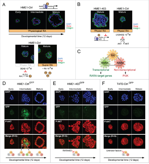 Figure 5: Tracing the different biological actions of physiological RA to a RARA mechanism of mammary epithelial cell fate. A-B. HME1Ctrl human mammary epithelial cells 3D morphogenesis (A, top) requires precise ‘physiological’ RA variation as well as transcriptional and non-transcriptional RARA functions, because 3D morphogenesis is hampered by both perturbation of ‘physiological’ RA level (e.g. ALDH inhibition by DEAB or addition of exogenous ‘supraphysiological’ RA) (A, bottom) and inhibition of either RARA transcriptional function (B, left) or RARA-PI3K signaling pathway (B, right). C. Hypothetical RA-RARA mechanism of mammary epithelial cell fate encompassing a RA metabolic module, a transcriptional RARA module exerting an epigenomic control of RARA-target genes, and a non-transcriptional RARA module controlling PI3K activity. D. HME1Ctrl cells stably transfected with RARE-GFP (HME1Ctrl-GFP) show differential spatiotemporal activation of RARA transcriptional signaling (GFP) and RARA-PI3K signaling (P-AKT) by ‘physiological’ RA at different stages of 3D morphogenesis. E-F. ‘Physiological’ RA fails to induce transcriptional RARA signaling (no GFP), but keeps sustaining RARA-PI3K signaling (P-AKT) during aberrant morphogenesis of both HME1403-GFP, with inhibition of RARA transcriptional function by RARA403 (E), and T47DCtrl-GFP, with inhibition of RARA transcriptional function by unknown factors (F).