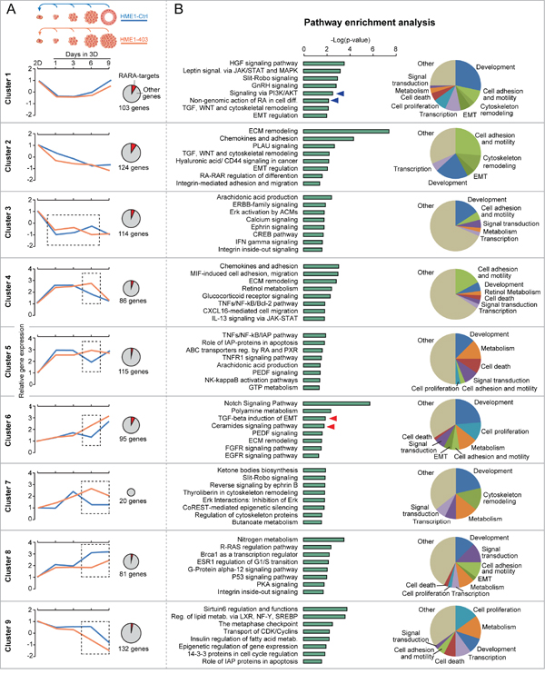 Figure 6: Bioinformatics analysis sheds light on the dynamics of RARA-regulated signaling pathways during 3D mammary epithelial morphogenesis. A. Comparison of the RNA-seq profile of HME1Ctrl acini at 1, 3, 6, and 9 days of 3D morphogenesis relative to cells grown in 2D culture identifies clusters of genes (including RARA-targets, see red portion of the pie charts) with similar expression trend during 3D morphogenesis (blue lines). The expression of many of these genes is significantly (p<0.05) different at specific stages (dotted squares) of 3D HME1403 aberrant morphogenesis (orange lines). B. According to Metacore pathway enrichment analysis, these gene clusters are significantly (p<0.05) associated with specific signaling pathways (left) involved in diverse cellular functions (pie charts on the right), including pathways modulated by RARA transcriptional (red arrows) and non-transcriptional (blue arrows) functions. Statistical analysis as reported in Supplementary Materials and Methods.