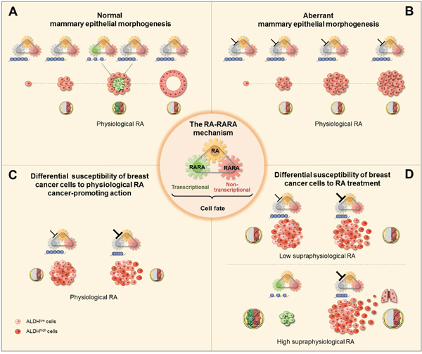 Figure 7: Scheme of the RA-RARA epigenetic mechanism of breast (cancer) epithelial cell fate (center). A. Physiological RA acts as the Janus bifrons god by regulating, in a spatiotemporal fashion, both the transcriptional RARA epigenetic function (chromatin changes at RARA-target genes, blue) and non-transcriptional RARA function to determine mammary epithelial cell fate decisions necessary for normal morphogenesis. B. Physiological RA promotes aberrant morphogenesis of mammary epithelial cells with epigenetic repression of RARA-target genes due to inhibition of RARA transcriptional function (┴) by activating non-transcriptional RARA. C. Differential susceptibility to physiological RA cancer-promoting action between breast cancer cell populations with increasing degree of inhibition of RARA transcriptional epigenetic functionality, mild (┴) or severe (┴), depends on the heterogeneity of RA synthesis by ALDH. D. Differential susceptibility to either anticancer or cancer-promoting actions of low/high supraphysiological RA treatment also depends on the cell-context specific degree of RARA transcriptional epigenetic functionality.
