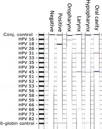 Figure 1: Representative plot of the nitrocellulose strip with HPV genotype-specific probes. Positive control, negative control, Oropharynx SCC, Laryngeal SCC, Hypopharynx SCC, Oral cavity SCC and human β-globin controls were shown.