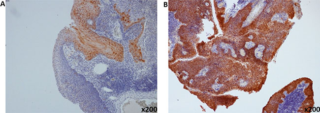 Figure 2: Representative pictures of immunohistochemical staining of p16. (A) P16-negative (B) and p16-positive oropharyngeal squamous cell carcinoma (magnification ×200).