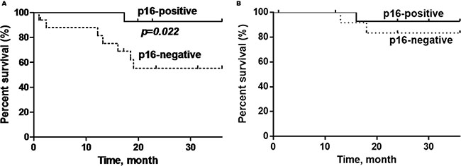 Since p16 IHC was predominantly identified in our OPSCC cohort, comparison of clinical features between p16-positive and p16-negative OPSCC patients was performed. There were no statistical differences in age, gender, T- or N classification and overall AJCC stage among patients with p16-positive or p16-negative OPSCC (Table 3).