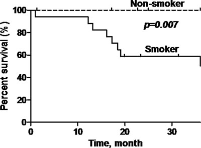 Figure 4: Overall survival of oropharyngeal SCC patients stratified according to smoking status. Black line = smoker, dashed line = non-smoker. Non-smokers have a significantly better overall survival (p = 0.007) compared to smokers.