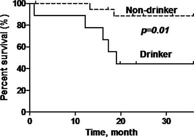 Figure 5: Overall survival of oropharyngeal SCC patients stratified according to alcohol consumption status. Black line = drinker, dashed line = non-drinker. Non-drinker has a significantly better overall survival (p = 0.01) compared to drinker.