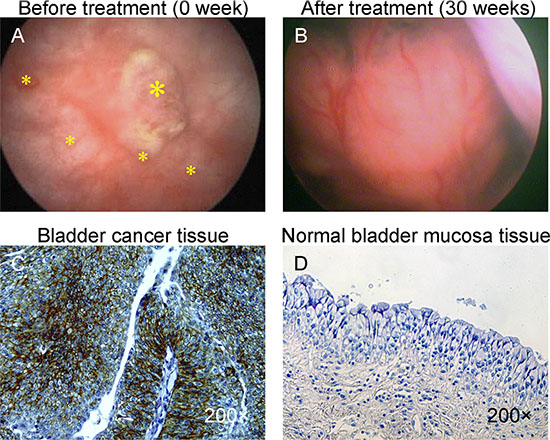 Figure 1: Photograph of bladder cancer with intravescical administration of BCMab1-Ra. (A) Cystoscope photo before treatment with BCMab-1Ra. (B) Cystoscope photo after treatment with BCMab1-Ra. BCMab1 recognized its antigen on the bladder cancer tissue (C), bot not on the normal bladder mucosa tissue (D).