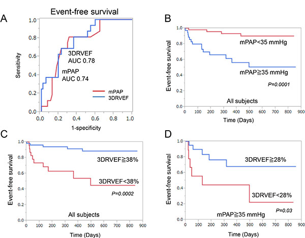 Figure 1: Correlation with clinical events. (A) Receiver-operating characteristic curve analysis revealed that 3DRVEF was superior to mPAP in predicting associated clinical events. (B) Event-free survival of patients with a mPAP ≧ 35 mmHg compared to patients with a mPAP < 35 mmHg in all subjects. (C) Event-free survival of patients with a 3DRVEF ≧ 38% compared to patients with a 3DRVEF < 38% in all subjects. (D) Event-free survival of patients with a 3DRVEF ≧ 28% compared to patients with a 3DRVEF < 28% in patients with severe PAH (mPAP > 35 mmHg). 3DRVEF = three-dimensional right ventricular ejection fraction, mPAP = mean pulmonary arterial pressure.