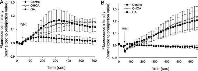 Figure 1: Both OHOA and OA stimulate release of calcium from intracellular stores. HeLa cells were loaded with cell-permeable Fluo-4 in a buffer with calcium (A) or without calcium (B), followed by addition of 25 μM OHOA or OA (or ethanol as control). The fluorescence intensity was measured every 20 seconds for 10 minutes, and the data were normalized to the level of fluorescence before addition of the compound. The mean values of three independent experiments are shown ± SEM.