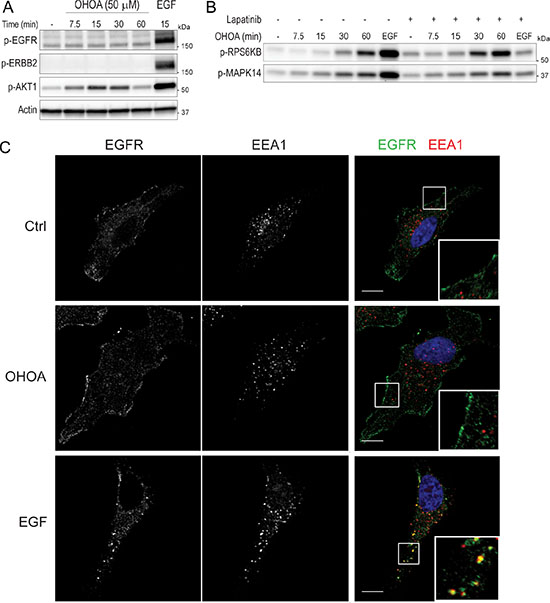 Figure 3: OHOA does not activate or internalize the EGFR. (A) HeLa cells were treated with 50 μM OHOA for the indicated time periods and cell lysates were prepared for immunoblotting. Treatment with 20 ng/ml EGF for 15 minutes was used as a positive control. The blots were probed with the indicated antibodies. (B) HeLa cells were pretreated with 2 μM lapatinib for 30 minutes before addition of 12.5 μM OHOA or 20 ng/ml EGF for 15 minutes, and cell lysates were prepared for immunoblotting. The blots were probed with the indicated antibodies. (C) HeLa cells were treated with 25 μM OHOA or 20 ng/ml EGF for 15 minutes, fixed and prepared for immunofluorescence with the indicated antibodies. Scale bar; 10 μm.