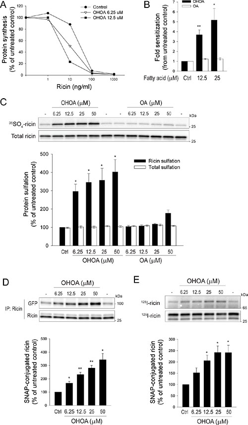 Figure 4: OHOA stimulates ricin toxicity and retrograde transport. (A–B). HeLa cells were preincubated with the indicated concentrations of OHOA or OA in leucine-free medium for 30 minutes, then increasing concentrations of ricin were added and the incubation continued for 3 hours. The protein synthesis was measured as described in Materials and Methods. (A) Data from one representative experiment. (B) The bars represent fold sensitization to ricin at 50% inhibition of protein synthesis. (C) HeLa cells were treated with the indicated concentrations of OHOA or OA and ricin sulfation was determined as described in Materials and Methods. A representative sulfation autoradiograph with the corresponding immunoblot is shown, and band intensities were quantified. (D) HeLa-GalT-GFP-SNAP cells were treated with the indicated concentrations of OHOA and Golgi transport of ricin was determined by the SNAP-tag assay as described in Materials and Methods. Representative immunoblots of total- and SNAP-tagged ricin are shown, and band intensities were quantified. (E) HeLa-ER-mCherry-SNAP cells were treated with the indicated concentrations of OHOA, and ER transport of ricin was determined by the SNAP-tag assay as described in Materials and Methods. Representative autoradiographs of total- and SNAP-tagged ricin are shown, and band intensities were quantified. All bars show mean values ± SEM quantified from at least 3 independent experiments; *p < 0.05; **p < 0.01 compared to untreated control.