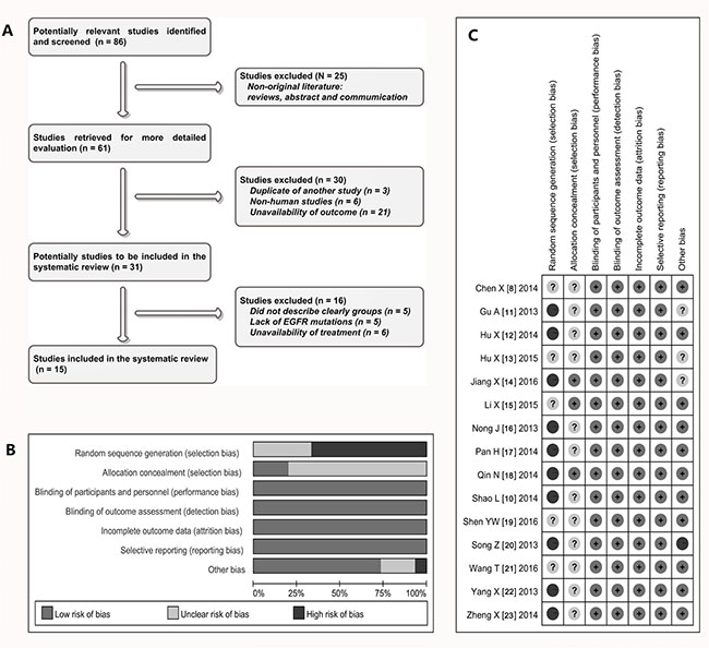 As shown in Figure 1A, preliminary searches defined 86 relative studies that described the relevant investigations on icotinib and NSCLC. Of them, we firstly excluded 25 studies because they were not original research documents. Of the 61 publications that remained, we abandoned 30 studies once more because of data duplication and unavailability of outcome. Of the remained 31 studies, we finally abolished other 16 studies due to the following reasons: unclear groups; lack of data on EGFR mutations; and some received other complicated treatment simultaneously. At the end of the identification process, 15 studies [8, 10–23] were considered eligible for further analysis, which included a total of 2,304 individuals (Table 1).