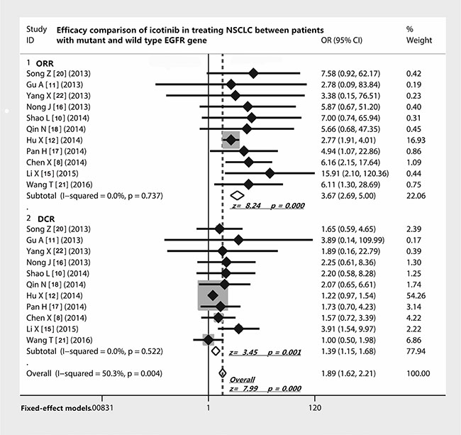 Figure 2: Efficacy comparison of icotinib in treating NSCLC patients with EGFR mutations and EGFR wild type gene. Patients with EGFR mutants had a remarkably higher ORR to icotinib in treating NSCLC; patients with EGFR mutants also showed a relatively higher DCR compared with those with wild type EGFR gene. Abbreviations: EGFR, epithelial growth factor receptor; NSCLC, non-small cell lung cancer; ORR, overall response rate; DCR, disease control rate; OR, odds ratio.