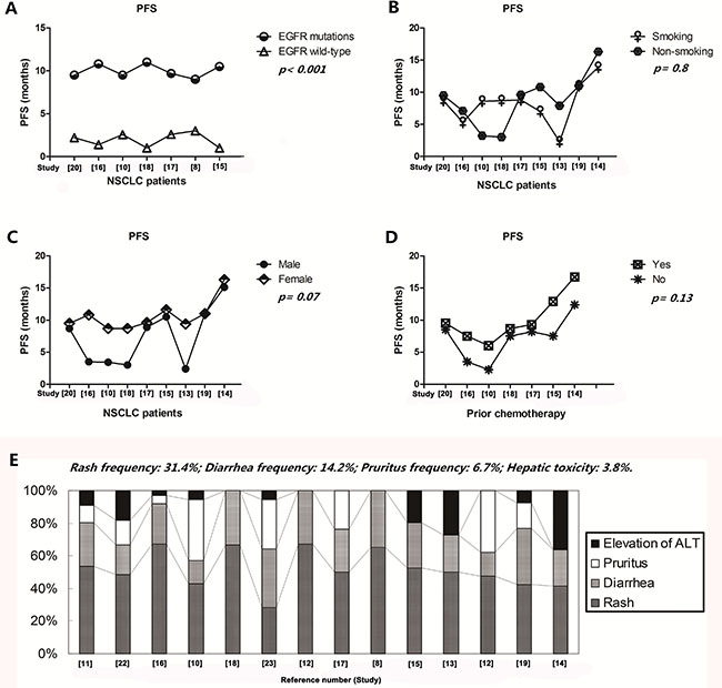 Figure 3: Influence of icotinib on PFS and tolerability in treating NSCLC patients with different clinical parameters. (A) Patients with EGFR mutants also showed a relatively longer PFS compared with those with wild type EGFR gene; (B–D) smoking, gender and prior chemotherapy did not have influences on the PFS when they received the therapy of icotinib; (E) the most common AEs were rash, diarrhea, pruritus and hepatic toxicity when patients accepted the icotinib therapy; Abbreviations: PFS, progression free survival; EGFR, epithelial growth factor receptor; NSCLC, non-small cell lung cancer; ALT, alanine transaminase.