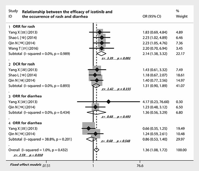 Four studies [10, 18, 21, 22, 25] investigated the relationship between efficacy of icotinib and occurrence of rash, which showed that the ORR of icotinib in patients with rash was significantly higher than those who did not have rash (OR = 2.14; 95% CI 1.38 to 3.32; Z = 3.39, p = 0.001) (Figure 4). However, the analysis of three studies [10, 18, 22] exhibited that the DCR of icotinib was not related to the occurrence of rash (OR = 1.31, 95% CI 0.90–1.89; Z = 1.42; p = 0.155) (Figure 4). In addition, two studies [18, 22] compared the efficacy of icotinib and the occurrence of diarrhea. We found that either ORR (OR = 1.36; z = 0.68, p = 0.493) or DCR (OR = 0.86; z = 0.60, p = 0.548) of icotinib therapy all did not correlate with the incidence of diarrhea (Figure 4).