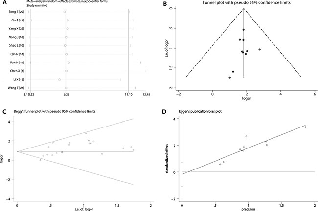 Figure 5: Sensitivity analysis and publication bias. (A) The exclusion of studies individually did not substantially modify the estimators, with OR values varying between 2.77 and 15.91; (B) the shape of the funnel appeared to be approximately symmetrical; (C) Begg’s test (p = 0.283) suggested that there was not publication biases; (D) Egger’s test (p = 0.67) indicated that publication biases did not exist.