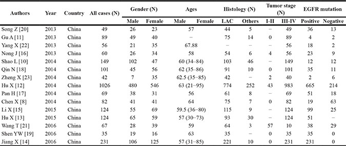 With the increasing environmental pollution and food safety problems, lung cancer in the People’s Republic of China is going up continuously [1]. It is estimated that there will be about 733,000 newly diagnosed invasive lung cancer cases in 2015 in China, and about 610,000 Chinese will die from lung cancer in 2015 [2]. Although studies on the early diagnosis and individual treatment of lung cancer have made great progress, NSCLC is still a very malignant disease characterized by a high incidence of mortality. Now, rapid advances in genomics and proteomicss of lung cancer have shown that targeted therapy against to specific gene and protein is more effective in treating advanced NSCLC such as tyrosine kinase inhibitors (TKIs) which targets mutated epithelial growth factor receptors (EGFRs) [3]. Research shows that the EGFR mutations is crucial because TKIs seem to be more effective in NSCLC with EGFR mutations [4]. Many trials suggest that TKIs treatment in patients with EGFR-mutated NSCLC has a significant survival benefit, and other combined treatment of chemotherapy and TKIs also significantly improve progression-free survival (PFS) in advanced NSCLC [5].