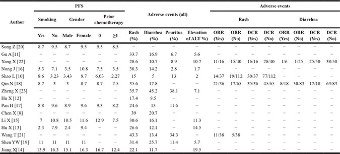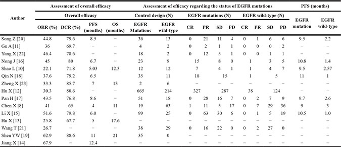 The extracted items included authors, years of publication, study design, country and region, EGFR mutations, test method of mutations, follow-up, missing data, administration, and treatment responses. The treatment responses were considered as key data: complete response (CR), partial response (PR), stable disease (SD) or progressive disease (PD), OS, PFS and AEs.