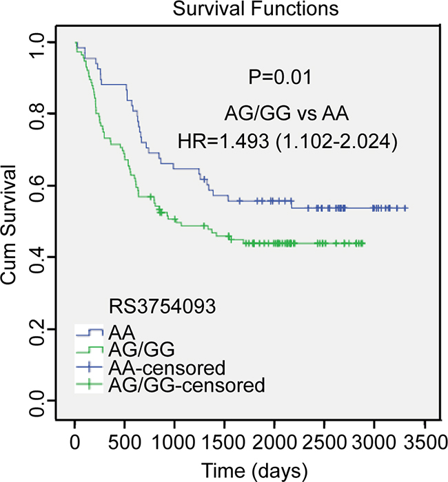 Data entry and consistency check were conducted on the EpiData3.1 software. The SPSS 20.0 software was used for the statistical analyses. Logistic regression models were used to estimate odds ratio (OR) and 95% confidence interval (CI). Gene-environment interactions and gene-gene interactions were performed through multiplicative model of binary logistic regression. Hardy-Weinberg Equilibrium (HWE) in the controls was tested by Haploview 4.2 software. Kaplan–Meier method, Log–rank test and COX regression were used on survival analysis.