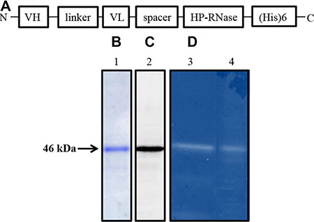 Figure 1: Schematic representation and biochemical analyses of purified 4LB5-HP-RNase. (A) Schematic representation of the human anti-Nucleolin immunoRNase 4LB5-HP-RNase. VH and VL, the Variable Heavy and Light chains of the anti-Nucleolin scFv; linker, the flexible oligopeptide conjugating VH and VL; spacer, the peptide connecting the scFv and RNase; HP-RNase, human pancreatic RNase. (B) SDS-PAGE analysis followed by Coomassie staining of the sample eluted by IMAC. Lane 1, fraction eluted from the column. (C) Western blotting analysis using an anti-His antibody of the sample as in Lane 1. (D) Zymogram of 4LB5-HP-RNase (Lane 4) using yeast RNA as a substrate; Lane 3, enzymatic activity of ERB-HP-RNase used as positive control of the native human pancreatic ribonuclease activity.