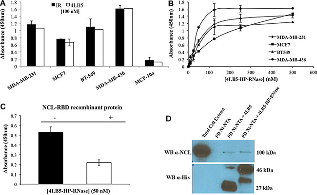 Figure 2: Binding of 4LB5-HP-RNase to NCL on cancer cells. (A) The binding of 4LB5-HP-RNase to NCL-positive MDA-MB-231, MCF-7, BT-549 or MDA-MB-436 breast cancer cells or to NCL-negative MCF-10a normal-like breast cells was tested by incubating the chimeric protein (100 nM) with the cells; 4LB5 was tested at equimolar doses as a positive control in parallel assays. (B) Binding curves of 4LB5-HP-RNase to surface NCL-positive MDA-MB-231 (rhomboids), MCF-7 (squares), BT-549 (triangles), MDA-MB-436 (circles) breast cancer cell lines performed by using increasing concentrations (5–500 nM) of the immunoRNase. All the experiments are representative of three independent experiments performed in triplicate. Mean + SD is reported. (C) ELISA assay performed by testing 4LB5-HP-RNase (50 nM) on MDA-MB-231 breast cancer cells in the absence (black) or in the presence (white) of equimolar doses of NCL-RBD recombinant protein. All the experiments are representative of three independent experiments performed in triplicate. Mean + SD is reported. (D) Pull-down assay performed on lysates of MDA-MB-231 cells using Ni-NTA resin and 4LB5 or 4LB5-HP-RNase. Ni-NTA resin incubated with total cell lysate in the absence of 4LB5 or 4LB5-HP-RNase was used as negative control. Anti-NCL antibody (upper panel) and anti-His antibody (Lower panel) were used to visualize the effective pull-down of endogenous NCL in the presence of either 4LB5 or 4LB5-HP-RNase.