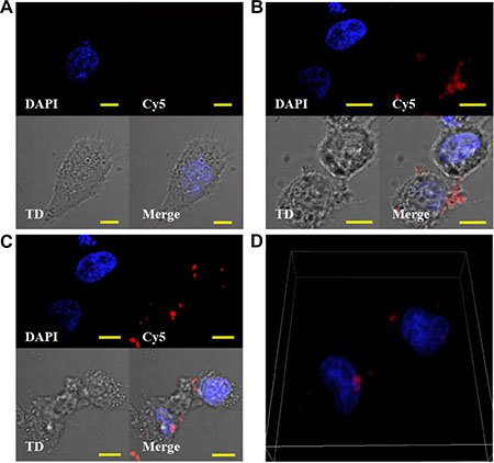 Figure 3: 4LB5-HP-RNase is internalized by TNBC cells. (A, C) MDA-MB-231 cells were cultured in the presence of Cy5 (A), 4LB5-Cy5 (B) or 4LB5-HP-RNase-Cy5 (C) for 4 h at 37°C. Labeled compounds that were not cell-associated were washed away. Cells were incubated with Hoechst nuclear staining, and microscopy images were acquired. For each experimental condition, Hoechst, Cy5 image stacks are presented as a 2 dimensional projection along with a single representative DIC image (TD). A merged image is also presented for each treatment. (D) 3D-rendering of the image series through the volume of 4LB5-HP-RNase (from 3C) treated cells to help visualization of the intracellular localization of 4LB5-HP-RNase. Scale bar = 10 μm.