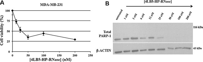 Figure 5: Effects of 4LB5-HP-RNase on cancer cell apoptosis. (A) Dose-response curve of NCL-positive MDA-MB-231 cells (rhomboids) treated for 72 h with increasing doses (10–200 nM) of 4LB5-HP-RNase. (B) Western Blotting analysis of total lysates from MDA-MB-231 cells treated with increasing concentrations (10–200 nM) of 4LB5-HP-RNase to evaluate PARP cleavage as a marker of apoptosis activation. Actin was used as loading control.