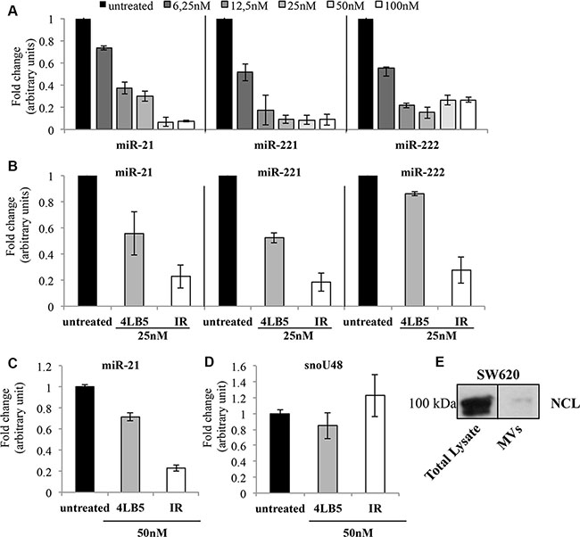 Figure 6: Effects of 4LB5-HP-RNase on cellular and EV-associated miRNAs. (A) NCL-dependent mature miR-21, -221 and -222 levels were analyzed by Real-Time PCR after 72 h of incubation of MDA-MB-231 cells with increasing concentrations (6–100 nM) of 4LB5-HP-RNase. (B) Comparison between the effects of 4LB5 (grey bars) and 4LB5-HP-RNase (white bars) on mature miR-21, -221 and -222 levels by using an equimolar concentration (25 nM) of compounds for the treatment of MDA-MB-231 cells. Relative microRNA expression levels were normalized for control untreated sample, and relative abundance (fold change) is reported. Data are the average of three independent experiments performed in triplicate. Mean + SD is reported. (C) The mature miR-21 levels were analyzed by Real-Time PCR on RNA extracted from exosomes derived from the conditioned medium of SW620 cancer cells treated for 72 h with equimolar doses (50 nM) of 4LB5-HP-RNase (white bars) or 4LB5 (grey bars), tested in a parallel assay. Relative microRNA expression levels were normalized for control untreated sample, and relative abundance (fold change) is reported. (D) The snoRNA RNU48 was used as negative control of RNAs cellular contamination. (E) Western Blotting analysis showing NCL in both total lysates and MVs from SW620 cells, used for the experiments reported in C and D.