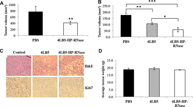 Figure 7: In vivo effects of 4LB5-HP-RNase on NCL-positive tumors induced in mice by using MDA-MB-231 breast cancer cells. (A) NOD-SCID (n = 5) mice were injected with 2 × 106 MDA-MB-231-Luc cells into the mammary fat pad. After 2 weeks, mice were treated with control PBS solution or 2 mg/kg of 4LB5-HP-RNase twice a week. Mice were monitored by IVIS weekly. At 6 week from injection (4 weeks of treatment), mice were sacrificed. Tumors were excised and measured. **P < 0.01 (B) In a second experiment, mice were treated with equimolar doses of 4LB5 or 4LB5-HP-RNase (2 mg/kg) or with PBS, as described for Figure 7A. *P < 0.05 (C) Representative images of H&E and Ki-67 staining of tumor tissue slices obtained from different fields are shown; 20× magnification is reported. (D) Body weight of mice treated with PBS (black bars), 4LB5 (grey bars) or 4LB5-HP-RNase (white bars). Measurements were performed at tumor excision.