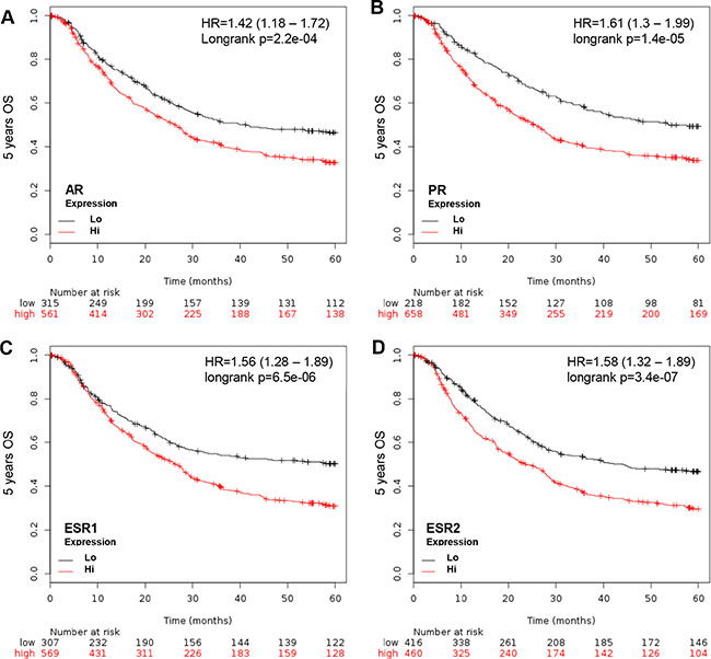 Figure 1: KM plotter evaluation of sex hormone nuclear receptors, including AR, PR, ESR1 and ESR2, in GCa 5-year OS. (A) AR expression status in GCa patients. Red line indicates high expression and black line indicates low expression. At the initial time point (0 months), 561 patients have high AR and 315 have low AR. At the last time point (60 months), 138 have high AR and 112 have low AR. The HR is 1.42 (range 1.18–1.72), and p-value is 2.2e-04. (B) PR expression status in GCa patients. The number of 0 month patients with high PR is 658, and low PR is 218. The 60-month patient number with high PR is 169, and low PR is 81. The HR is 1.61 (range 1.3–1.99), and p-value is 1.4e-05. (C) ESR1 expression status in GCa patients. The 0 month patient number with high ESR1 is 569, and low ESR1 is 307. The 60-month patient number of high ESR1 is 128, and low ESR1 is 122. The HR is 1.56 (range 1.28–1.89), and p-value is 6.5e-06. (D) ESR2 expression status in GCa patients. The 0 month patient number of high ESR2 is 460, and low ESR2 is 307. The 60–month patient number of high ESR2 is 104, and low ESR2 is 146. The HR is 1.58 (range 1.32–1.89), and p-value is 3.4e-07.
