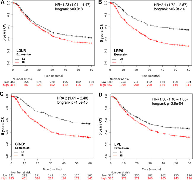 Figure 2: KM plotter evaluation of L/R route, including LDLR, LRP6, SR-B1 and LPL in GCa 5-year OS. (A) LDLR expression status in GCa patients. Red line indicates high expression and the black line indicates low expression. The 0 month patient number with high LDLR is 416, and low LDLR is 460. The last 60-month patient number with high LDLR is 97, and low LDLR is 153. The HR is 1.23 (range 1.04–1.47), and p-value is 0.018. (B) LRP6 expression status in GCa patients. The 0 month patient number with high LRP6 is 567, and low LRP6 is 309. The 60-month patient number with high LRP6 is 116, and low LRP6 is 134. The HR is 2.1 (range 1.72–2.57), and p-value is 6.9e-14. (C) SR-B1 expression status in GCa patients. The 0 month patient number with high SR-B1 is 639, and low SR-B1 is 241. The 60-month patient number with high SR-B1 is 145, and low SR-B1 is 105. The HR is 2 (range 1.61–2.48), and p-value is 1.5e-10. (D) LPL expression status in GCa patients. The 0 month patient number with high LPL is 500, and low LPL is 376. The 60-month patient number with high LPL is 120, and low LPL is 130. The HR is 1.38 (range 1.16–1.65), and p-value is 3.8e-04.