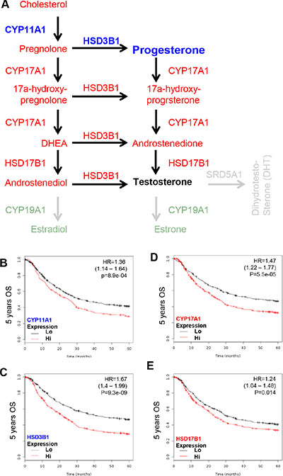 Figure 3: KM plotter evaluation of sex steroid lipidome related enzyme, including CYP11A1, CYP17, HSD3B1 and HSD17B1 in GCa 5-year OS. (A) Schematic illustration of sex steroid lipidomes and responding genes, including CYP11A1 (conversion of cholesterol to pregnolone; blue colored), CYP17 (conversion between pregnolone, 17a-hydroxyprognolone, androstenedione, progesterone, 17a-hydroxy- progesterone and DHEA; red colored), HSD3B1 (conversion of pregnolone, 17a-hydroxyprognolone, or androstenedione to progesterone, 17a-hydroxyprogesterone, or DHEA; red colored) and HSD17B1 (conversion of DHEA or androstenedione to androstenediol or testosterone; red colored). (B) CYP11A1 expression status in GCa patients. The HR is 1.36 (range 1.14–1.64), and p-value is 8.9e-04. (C) HSD3B1 expression status in GCa patients. The HR is 1.67 (range 1.4–1.99), and p-value is 9.3e-09. (D) CYP17 expression status in GCa patients. The HR is 1.47 (range 1.22–1.77), and p-value is 5.5e-05. (E) HSD17B1 expression status in GCa patients. The HR is 1.24 (range 1.04–1.48), and p-value is 0.014.