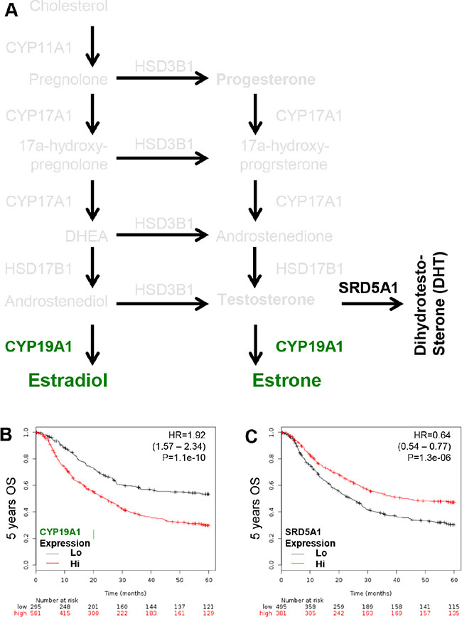 Figure 4: KM plotter evaluation of rate limiting step enzymes for estradiol (CYP19A1; aromatase) and DHT (SRD5A1; 5α-reductase) in GCa 5-years OS. (A) Schematic illustration of estradiol and DHT lipidomes and responding genes, including CYP19A1 (conversion of androstenedione or testosterone to estradiol or estrone; green colored), SRD5A1 (conversion of testosterone to DHT; black colored). (B) CYP19A1 expression status in GCa patients. The HR is 1.92 (range 1.57–2.34), and p-value is 1.1e-10. (C) SR-B1 expression status in GCa patients. The HR is 0.64 (range 0.54–0.77), and p-value is 1.3e-06.