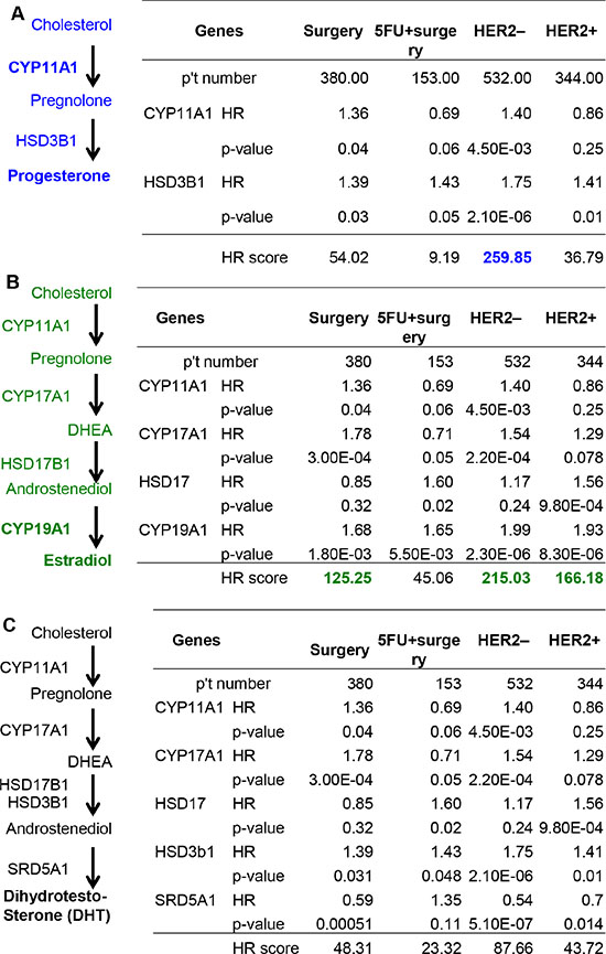 Figure 5: Calculation of the HR score of steroidogenic lipidomes in GCa progression. (A) Progesterone anabolic enzymes CYP11A1 and HSD3B1 in surgery, 5-FU and surgery, HER2– or HER2+ subcategories of GCa patients. The HR score of each subcategory are: 54.02 for surgery, 9.19 for 5-FU and surgery, 259.85 for HER2– and 36.79 for HER2+ patients. (B) Estradiol anabolic enzymes CYP11A1, CYP17, HSD17B1 and CYP19A1 in the four subcategories of GCa patients. The HR score of each subcategory are: 125.25 for surgery, 45.06 for 5-FU and surgery, 215.03 for HER2– and 166.18 for HER2+ patients. (C) DHT anabolic enzymes CYP11A1, CYP17, HSD3B1 and SRD5A1 in four the subcategories of GCa patients. The HR score of each subcategory are: 48.31 for surgery, 23.32 for 5-FU and surgery, 87.66 for HER2– and 43.72 for HER2+ patients.