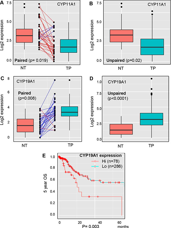 Figure 6: Expression analysis of CYP11A1 and CYP19A1 in non-tumor versus tumor parental lesions of GCa with DriverDB.v2 platform. (A) Paired comparison of CYP11A1 expression in non-tumor (NT) and tumor-parental (TP) of gastric cancer patients. TP is significantly lower than NT, with a p-value 0.019. (B) Unpaired comparison of CYP11A1 expressions in NT and TP of gastric cancer patients. TP is significantly lower than NT, with a p-value 0.02. (C) Paired comparison of CYP19A1 expressions in NT and TP of gastric cancer patients. TP is significantly higher than NT, with a p-value 0.008. (D) Unpaired comparison of CYP19A1 expressions in NT and TP of gastric cancer patients. TP is significantly higher than NT, with a p-value less than 0.0001. (E) Validation of the database cohort association of CYP19A1 expressions to 5-year overall survival (OS) in GCa patients from the TCGA database. The patients were divided to two groups: hi (high expression; n = 78), and lo (low expression; n = 286). The logrank test p-value = 0.003.