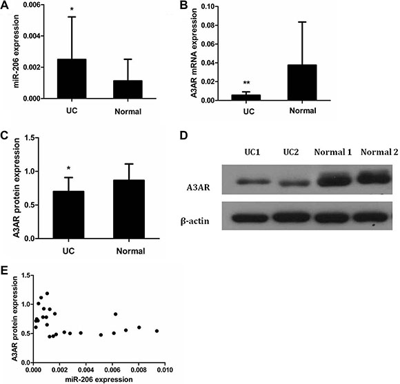 Figure 1: Expression and correlation of miR-206 and A3AR in UC tissues. Expression in UC and normal tissues of (A) miR-206, (B) A3AR mRNA, and (C) A3AR protein. (D) Representative western blotting showing A3AR protein expression in UC and normal tissues. Data are presented as means ± SD of 3 independent experiments. *P < 0.05; **P < 0.01. (E) Correlation of miR-206 and A3AR expression (Pearson correlation r = −0.404, P < 0.05).