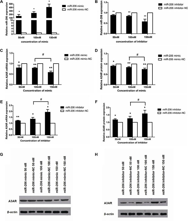 Figure 3: miR-206 downregulated A3AR expression. (A, B) miR-206 expression was increased and decreased in HT-29 cells after transfection with miR-206 mimic and miR-206 inhibitor, respectively, as compared with the expression in cells transfected with the corresponding NCs. (C, D) A3AR mRNA and protein expression was significantly decreased in a concentration-dependent manner in HT-29 cells transfected with miR-206 mimic, as compared with levels in the corresponding NC-transfected cells. (E, F) A3AR mRNA and protein expression was significantly increased in a concentration-dependent manner in HT-29 cells transfected with miR-206 inhibitor (relative to NC). (G, H) Representative western blotting showing A3AR protein expression following various transfections. Results are expressed as fold-change relative to NC and presented as means ± SD of 3 independent experiments. *P < 0.05 and **P < 0.01, compared with corresponding NC; #P < 0.05, between indicated groups.
