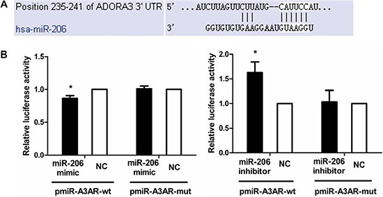Figure 4: miR-206 targeting of A3AR 3′-UTR. (A) The miR-206 target site in the 3′-UTR of A3AR mRNA predicted by TargetScan. (B) Dual-luciferase reporter assay. HT-29 cells were cotransfected with pmiR-A3AR-wt (or pmiR-A3AR-mut) and miR-206 mimic (or miR-206 inhibitor). Luciferase activity of pmiR-A3AR-wt was significantly decreased and increased by miR-206 mimic and miR-206 inhibitor, respectively, relative to corresponding NCs; however, pmiR-A3AR-mut luciferase activity was unaffected by miR-206 mimic or inhibitor. Results are expressed as fold-change relative to NC and presented as means ± SD of 3 independent experiments. *P < 0.05, compared with NC group.