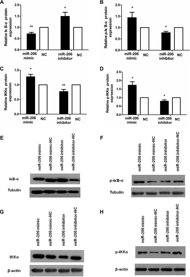 Figure 6: miR-206 decreased IκB-α and increase p-IκB-α, IKKα, and p-IKKα expression in TNF-α-treated cells. (A–D) Transfection with miR-206 mimic resulted in a decrease in IκB-α and an increase in p-IκB-α, IKKα and p-IKKα expression levels in TNF-α-treated cells, whereas miR-206-inhibitor transfection led to an increase and decrease, respectively, in these levels. (E–H) Representative western blotting showing IκB-α, p-IκB-α, IKKα and p-IKKα expression in the indicated groups. Results are expressed as fold-change relative to NC and presented as means ± SD of 3 independent experiments. *P < 0.05 and **P < 0.01, compared with the corresponding NCs.