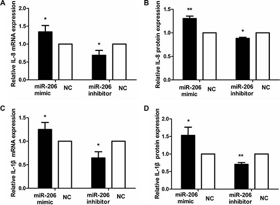 Figure 7: miR-206 increased IL-8/IL-1β expression in TNF-α-treated cells. Transfection with miR-206 mimic and inhibitor resulted, respectively, in an increase and decrease in IL-8 and IL-1β mRNA expression and protein secretion in TNF-α-treated cells. Results are expressed as fold-change relative to NC and presented as means ± SD of 3 independent experiments. *P < 0.05 and **P < 0.01, compared with the corresponding NCs.
